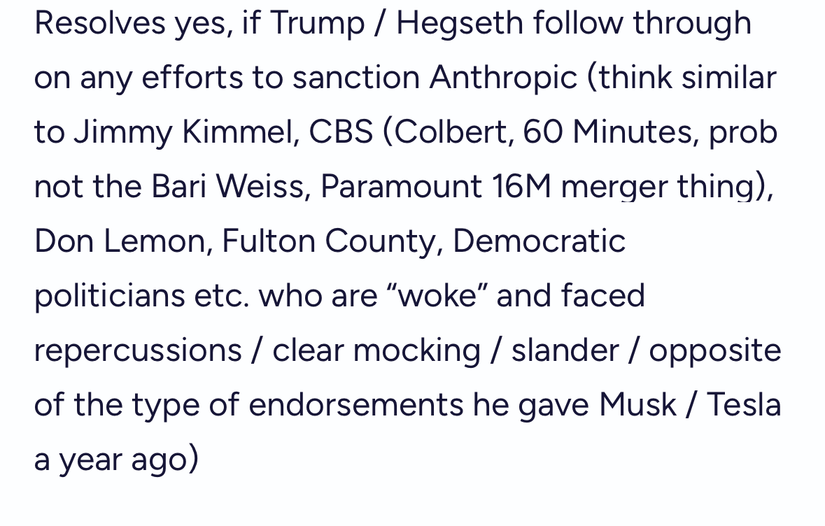 Resolves yes, if Trump / Hegseth follow through on any efforts to sanction Anthropic (think similar to Jimmy Kimmel, CBS (Colbert, 60 Minutes, prob not the Bari Weiss, Paramount 16M merger thing), Don Lemon, Fulton County, Democratic politicians etc. who are “woke” and faced repercussions / clear mocking / slander / opposite of the type of endorsements he gave Musk / Tesla a year ago)