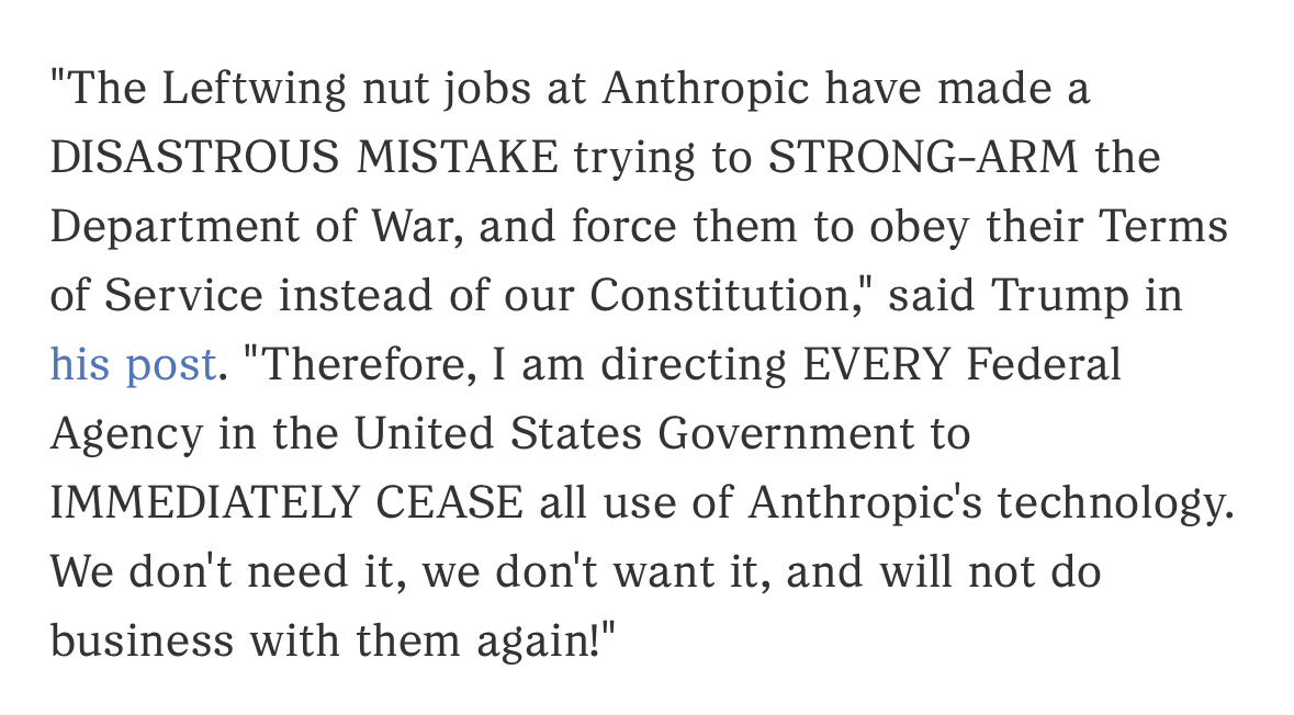 Rhetoric (Passed the Massie Threshold):The language being used by the administration is significantly harsher than what was directed at Massie. While Massie was called a "moron," Anthropic is being labeled with ideological "woke" terms usually reserved for Trump’s cultural enemies. Hegseth explicitly stated, “Department of War AI will not be woke” in direct reference to this dispute.